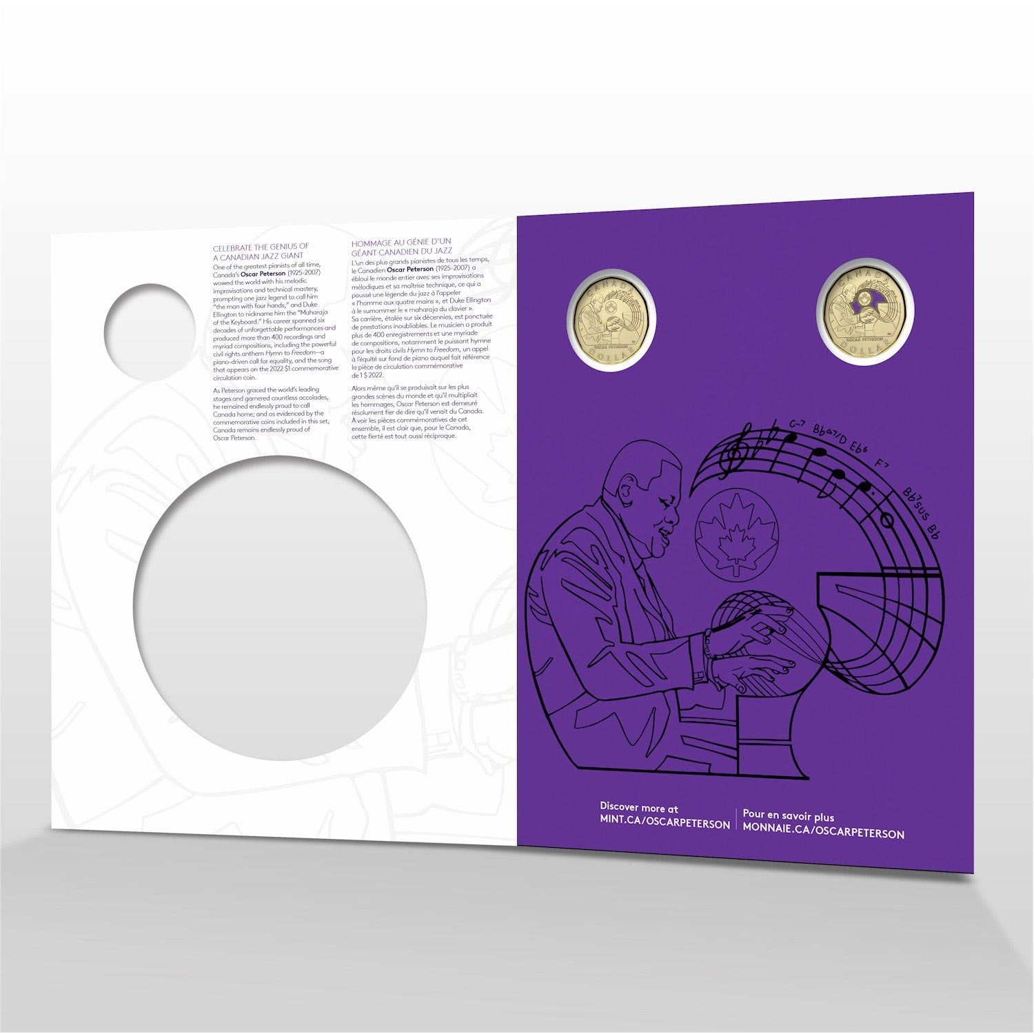 Issued to honour the life and legacy of legendary jazz pianist and composer Oscar Peterson (1925–2007), this 2022 collector keepsake set includes all standard Canadian circulation denominations. The highlight is the special $1 commemorative coin, featuring Peterson playing piano with musical notes from his iconic composition Hymn to Freedom. Designed by artist Valentine De Landro, the coin reflects Canada’s pride in one of its greatest musical icons. The obverse carries the effigy of Queen Elizabeth II by Susanna Blunt.