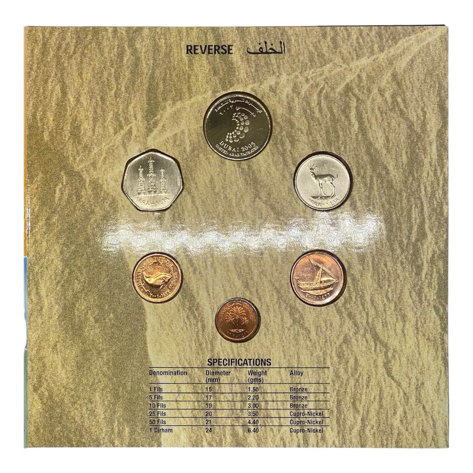 Official 2003-dated UNC coin set issued in collaboration with the Central Bank of the U.A.E. and presented in a premium Royal Mint folder. The set contains all UAE coins in circulation during the year, housed in a high-quality illustrated presentation pack with bilingual (English & Arabic) text, UAE map artwork, and full technical specifications.